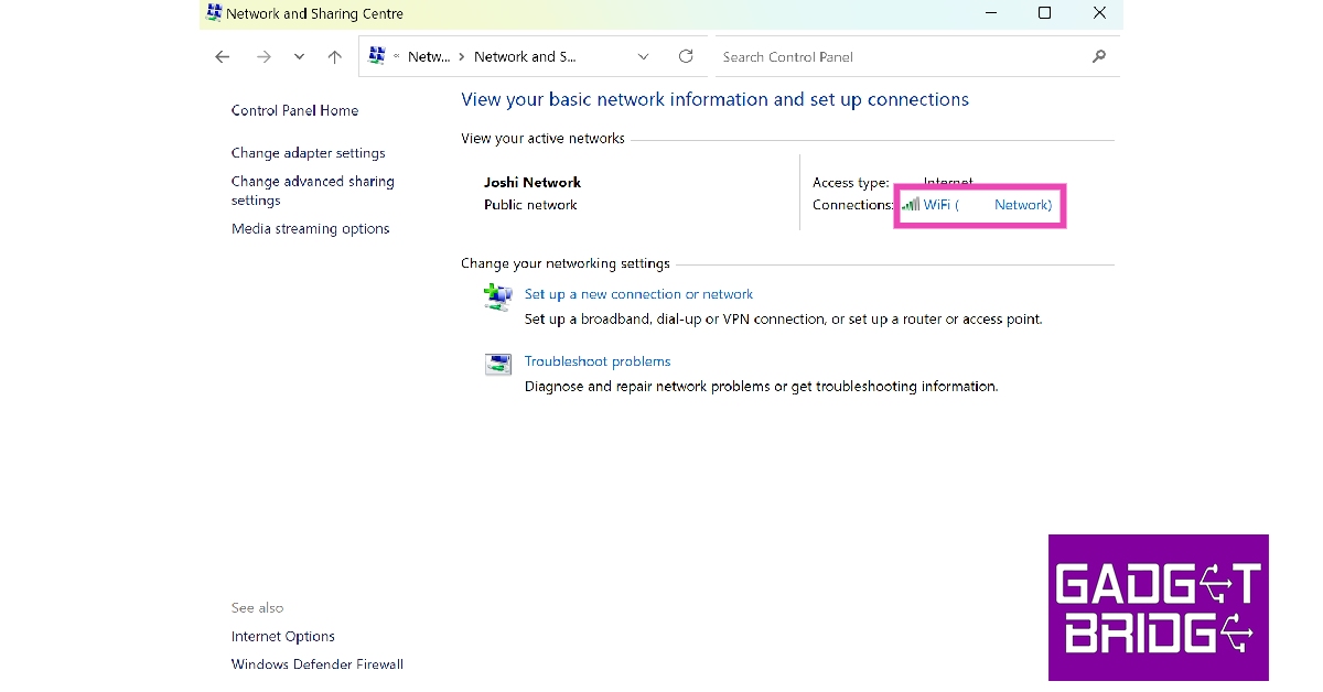 Trin 2:På en Windows 11-pc skal du klikke påNetværks- og delingscenter. Windows 10-brugere skal klikke påStatus>Netværks- og delingscenter.