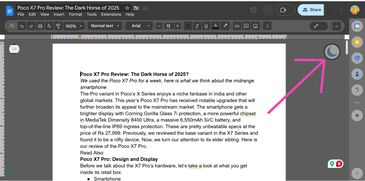 Google Docs tilbyder også muligheden for at ændre sidefarven til sort. Dette omfavner dog ikke fuldt ud æstetikken i et mørkt tema.