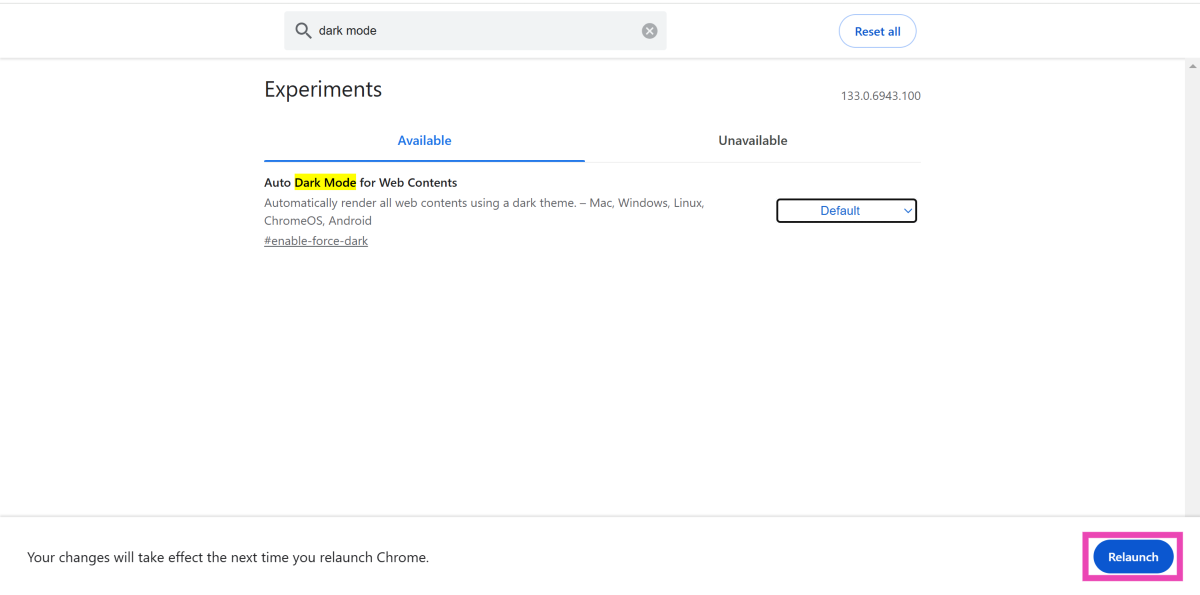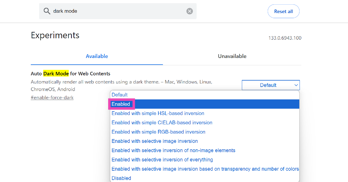 Gå til chrome://flags, søg efter 'Dark Mode', tryk på rullemenuen ved siden af 'Auto Dark Mode for Web Contents' og vælg 'Aktiver'.