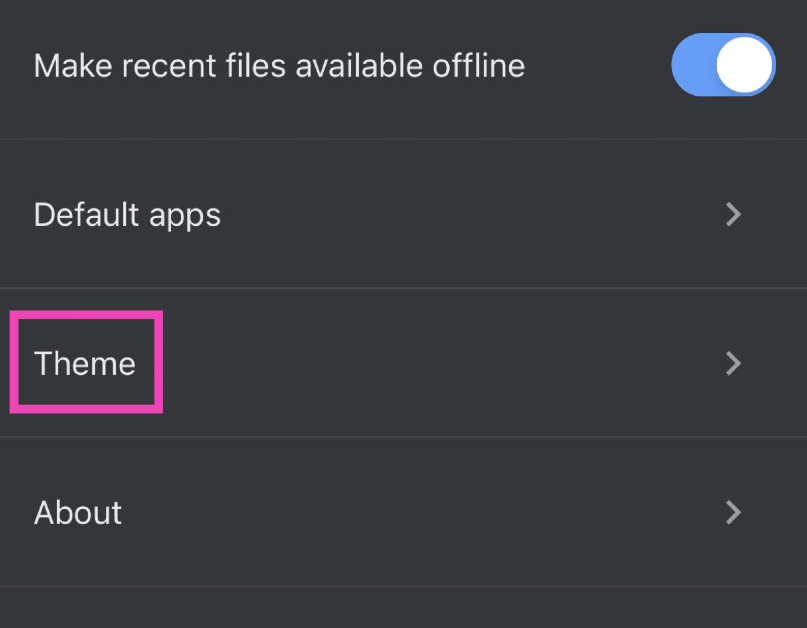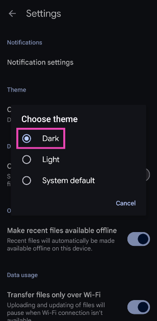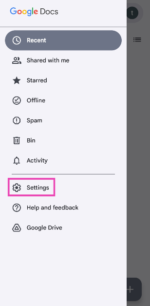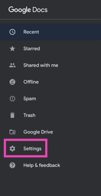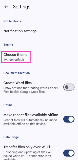 Start Docs-appen, tryk på hamburgermenuen, gå tilIndstillinger>Vælg temaog vælg 'Mørk'.
