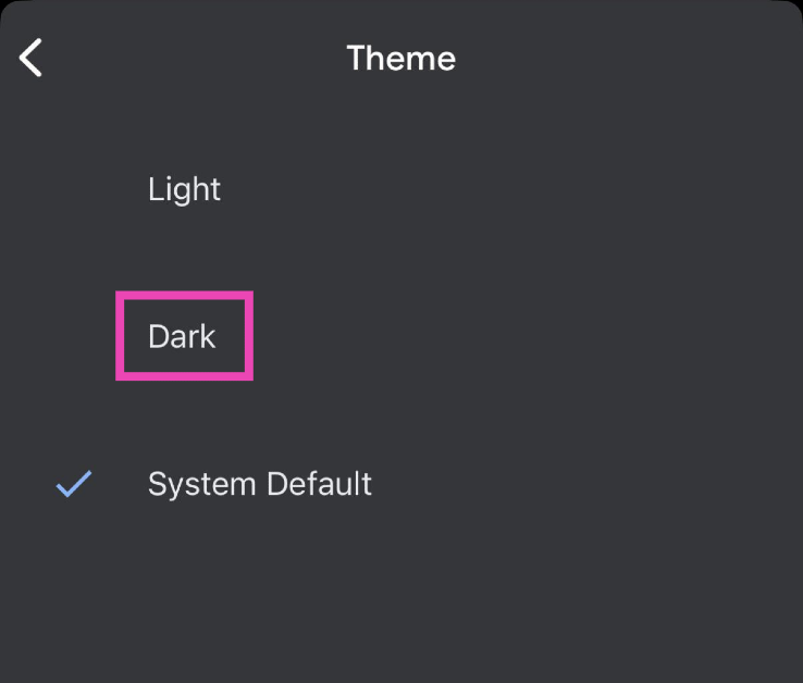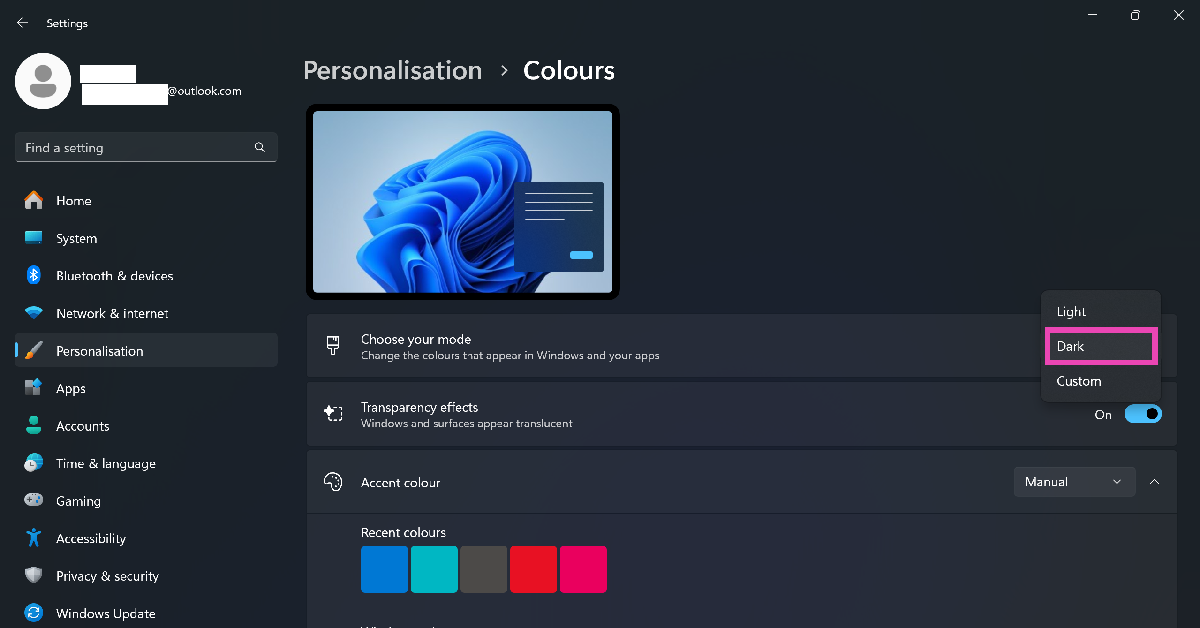 Trin 3:Klik på rullemenuen ved siden afVælg din tilstandog vælgMørk.