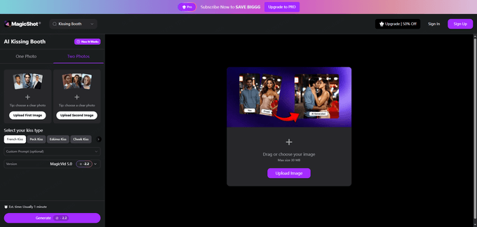 MagicShot AI er designet til at skabe romantiske og sjove AI-videoer. Den understøtter AI-genererede kyssescener med realistiske ansigtsudtryk.