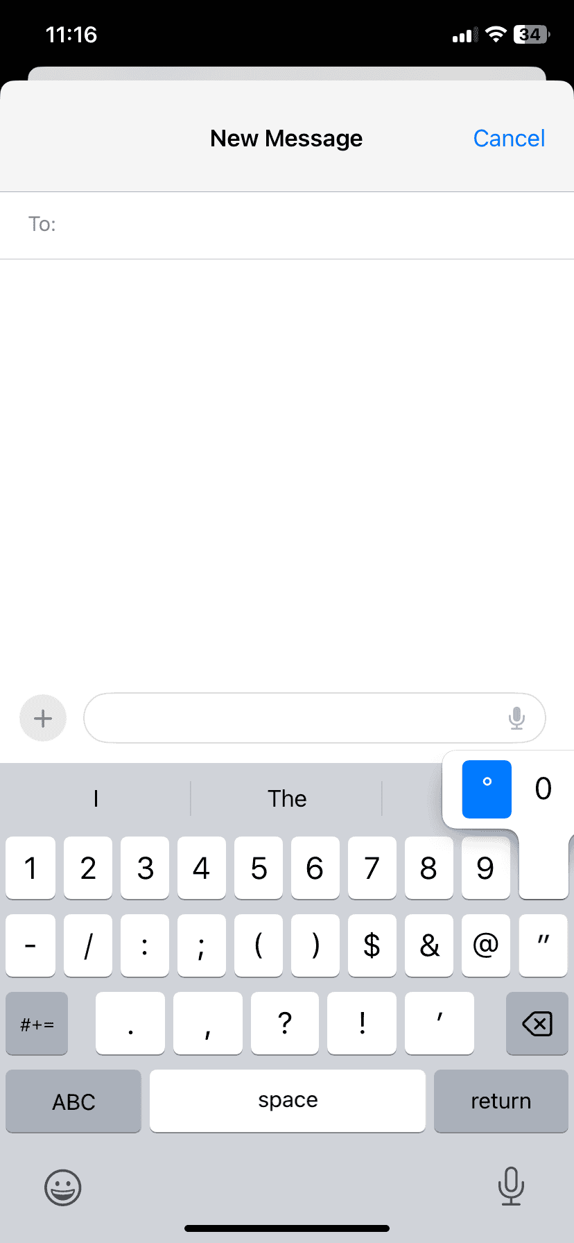 Gradsymbolet er placeret på det numeriske tastatur på iOS-enheder. Det er skjult under nul-tasten (0). For at få adgang til den skal du trykke på og holde nul-tasten nede, indtil yderligere muligheder vises.