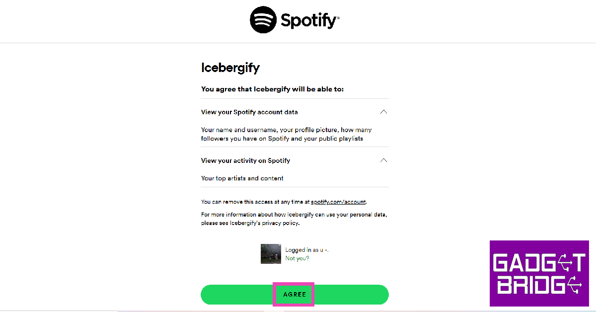 Trin 4:Giv Icebergify tilladelse til at se dine Spotify-kontodata og lytteaktivitet.