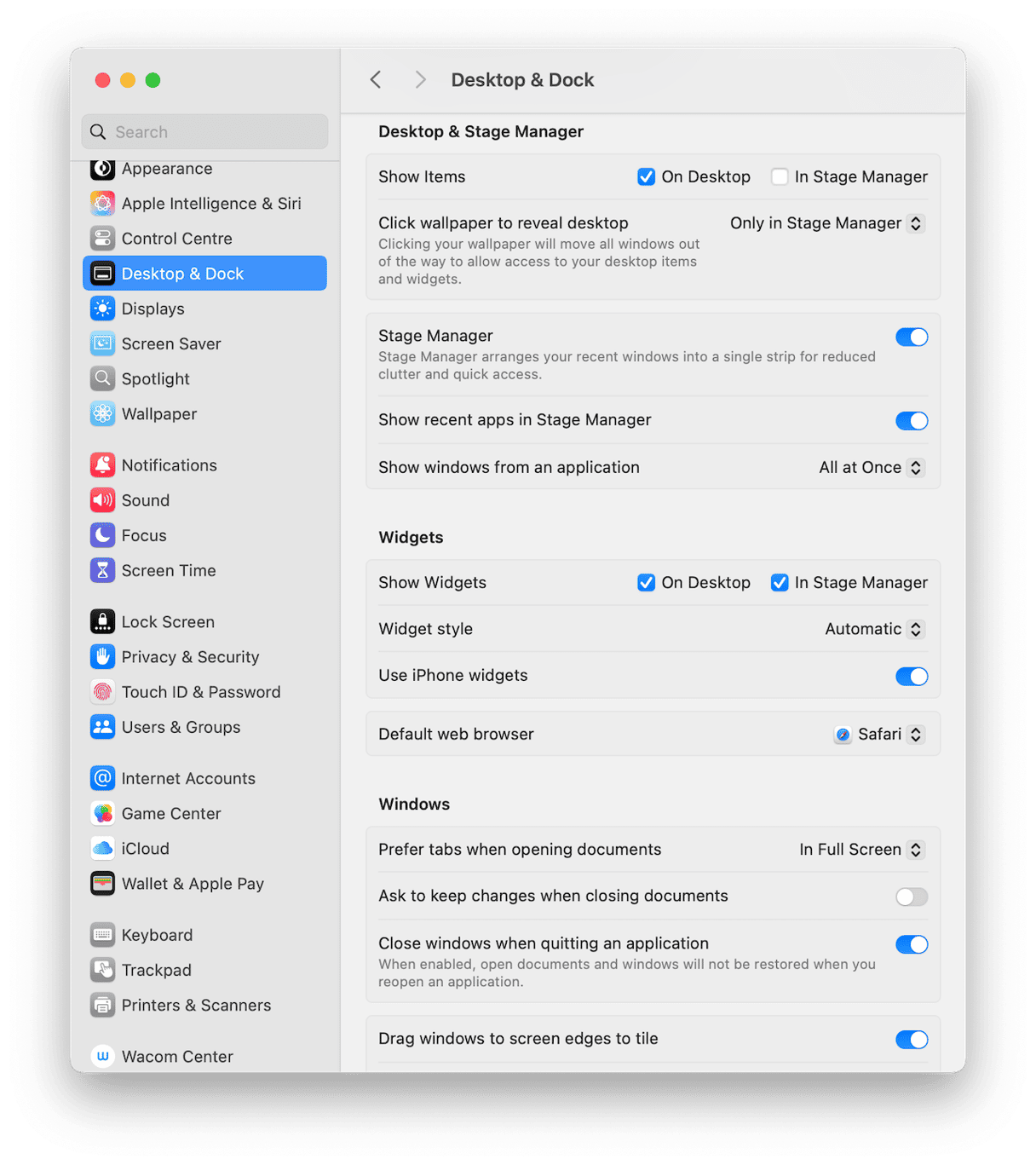 - Hvis du har widgets på dit skrivebord og vil se dem i Stage Manager, skal du gå til Widgets-sektionen i Desktop & Dock og vælge 'I Stage Manager' ud for 'Vis widgets'.