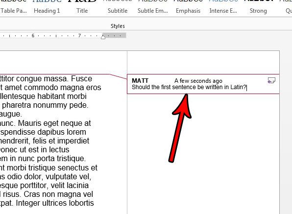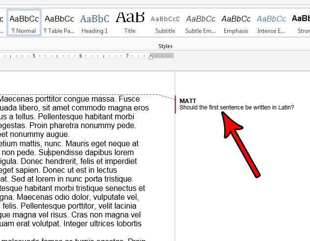 Trin 5: Klik hvor som helst inde i dokumentets brødtekst for at fuldføre kommentaren. Det vil nu blive vist i markeringsområdet til højre for dokumentet, med en stiplet linje trukket fra kommentaren til den del af dokumentet, som kommentaren vedrører.