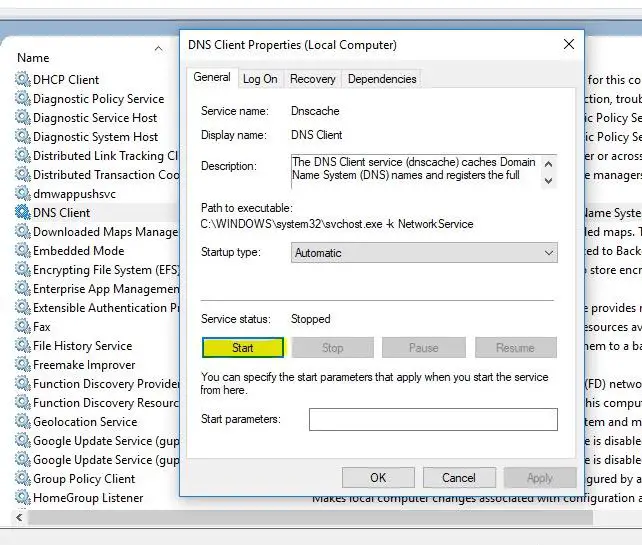 Maar soms melden gebruikers dat de DNS-clientservice grijs is en de DNS-clientservice niet kan starten.