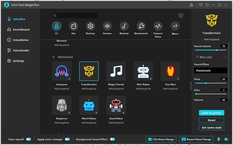 Tegenwoordig talrijkrobotachtige stemwisselaars. De meeste resultaten van hun beweringen zijn echter onjuist. Maar dat is niet het gevalUnicTool MagicVox. De App heeft alle kwaliteiten die nodig zijn om er de topfavoriet van het publiek van te maken. Het heeft meer dan 200 stemfilters en talloze hulpmiddelen voor audioaanpassing. Met UnicTool MagicVox zeg je hallo tegen streaming met een andere stem.