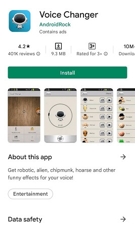 Wil je wat hilarische effecten op je stem toepassen? Wat dacht je van een babystem, een vrouwenstem of eenrobotstem? Het kan uw audio moeiteloos naar dergelijke versies converteren. Met Voice Changer kunt u uw stem aanpassen aan uw voorkeuren. Bovendien heeft de app een beoordeling van 4,2 sterren en is hij wereldwijd meer dan tien miljoen keer gedownload.