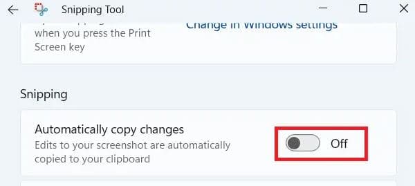 - Als de app crasht tijdens het maken van een screenshot, open dan het knipprogramma, klik op de drie stippen in de rechterbovenhoek en selecteer 'Instellingen'. En schakel de “Wijzigingen automatisch kopiëren" optie onder Knippen.