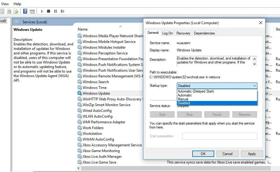 - Wijzig hier het opstarttype in uitgeschakeld en stop vervolgens de service naast de servicestatus