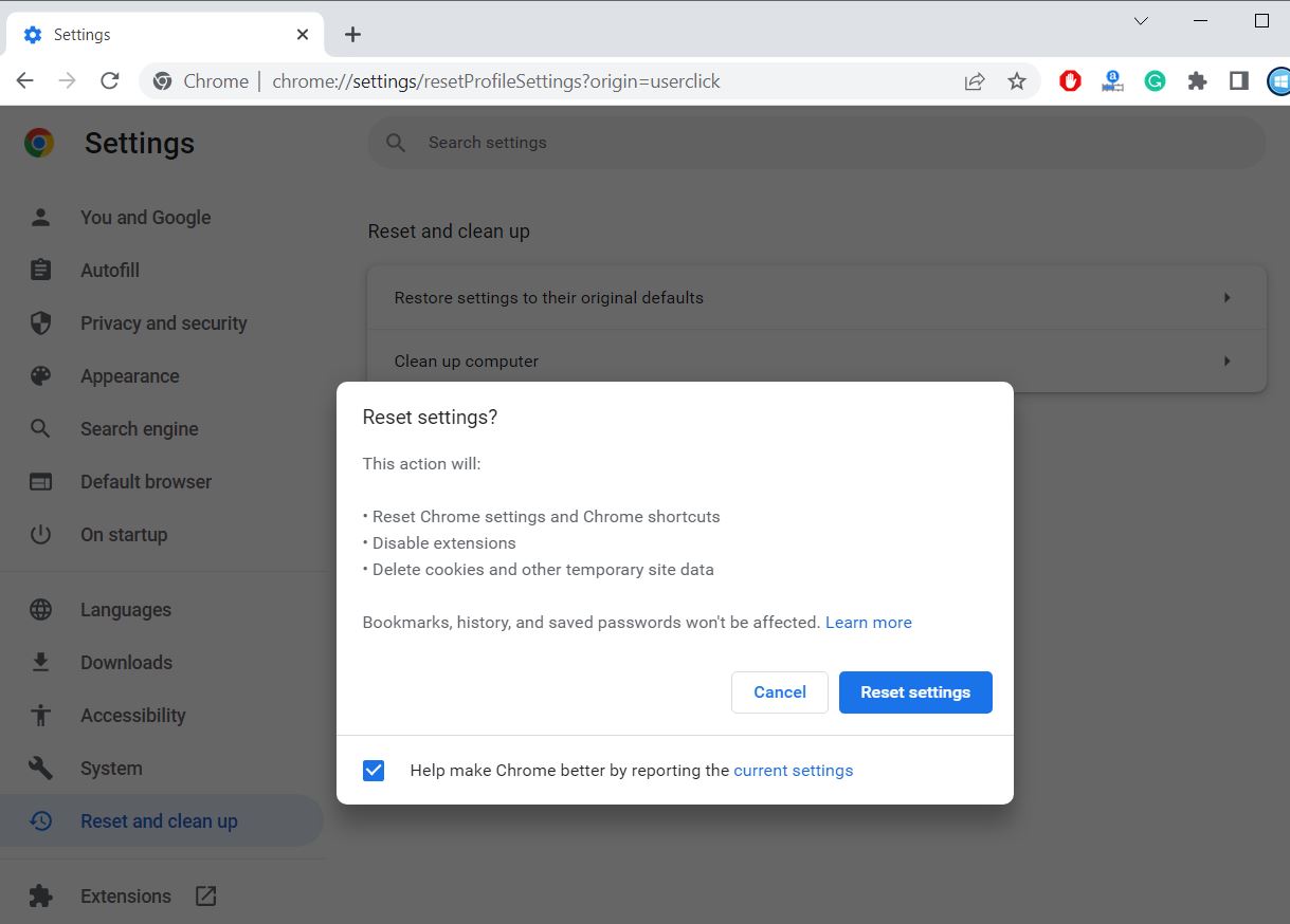 Als je daarin kunt downloaden in de incognitomodus dan is het waar dat er een probleem is in de instellingen en add-ons of extensies, dan kun je Chrome terugzetten naar de originele instellingen of terugkeren naar de fabrieksinstellingen.