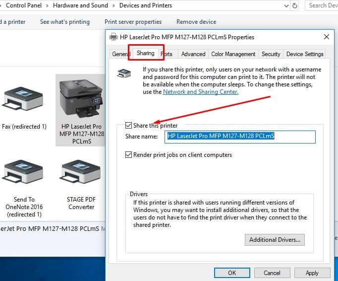 - Ga naar het tabblad Delen en vink de optie Deze printer delen aan, zoals hieronder weergegeven.