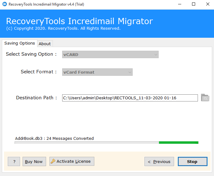 Nu begint het proces voor het exporteren van IncrediMail-contacten naar een vCard-bestand (VCF). U kunt het back-upproces analyseren met het progressieve live conversierapport.