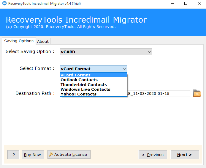 Nu zijn er vier formaten die de tool biedt: vCard-formaat, Outlook-contacten, Thunderbird-contacten, Windows Live-contacten, Yahoo! Contacten. SelecteervCard-formaatom een back-up te maken van IncrediMail-contacten naar vCard.