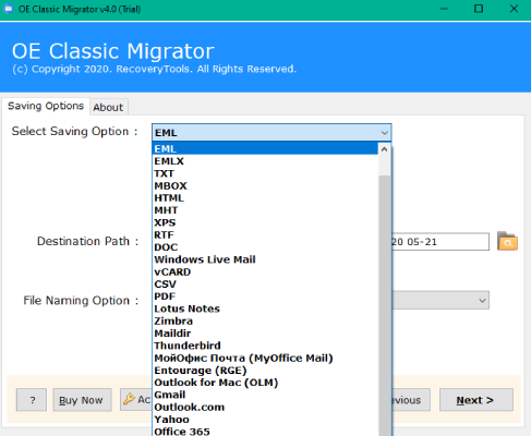 Daarna,selecteer de EML-optieuit de meerdere opties voor het opslaan van bestanden die beschikbaar zijn in de GUI.