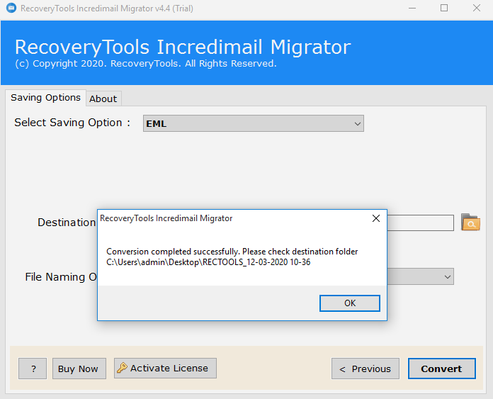 - SelecteerEML als opslagoptieen voer een inbestemming pad.