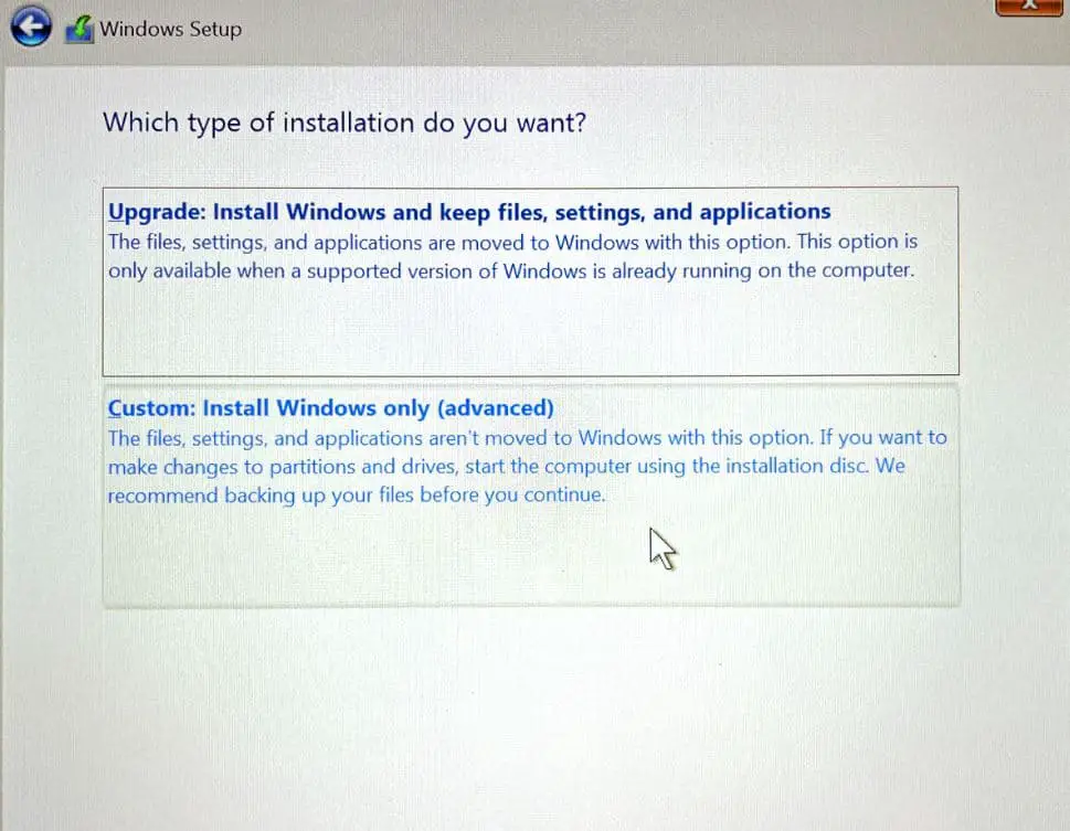 - SelecteerAangepast: installeer alleen Windows(geavanceerd) om een schone installatie uit te voeren.