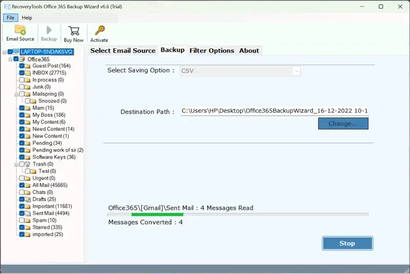 - Raak op deBack-upom de Office 365-mailbox naar CSV-formaat te exporteren en te wachten.
