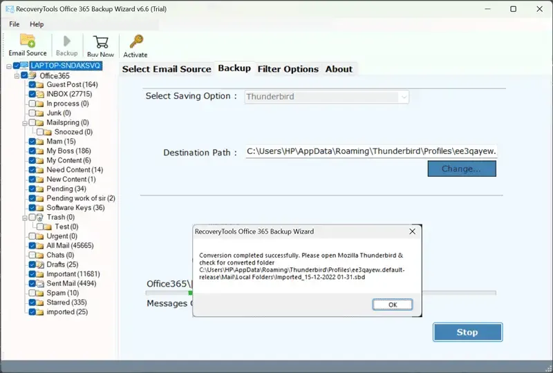 - Het proces van Office 365 export mailbox naar CSV-bestand is geweestafgerond.