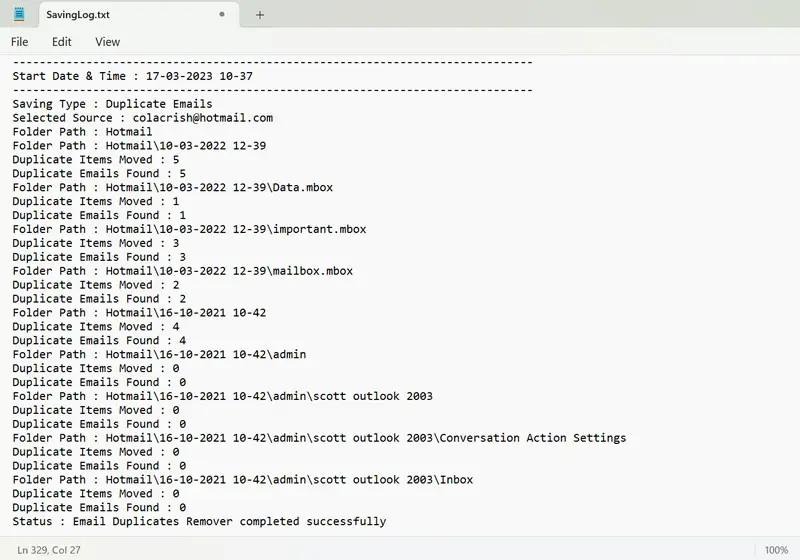 Jaren:Na voltooiing van het proces om Outlook 365-e-mails naar CSV-formaat te exporteren. De tool maakt automatisch een lograpportbestand (SavingLog.txt). Dit bestand bevat gedetailleerde informatie over geëxporteerde e-mails met volledige informatie.