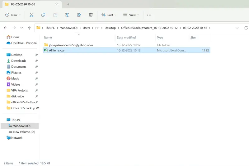 - Ga naar debestemming locatieen ontvang voor elke O365-map een afzonderlijk CSV-bestand.