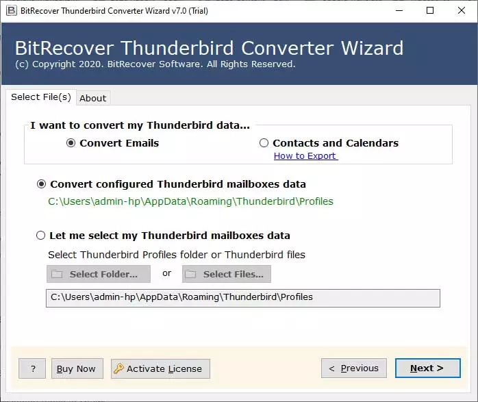 Opties voor dubbele bestandsselectie:De software biedt gebruikers twee keuzes voor het importeren van Thunderbird-berichten in de gebruikersinterface. Beide gebruikers kunnen e-mails handmatig of automatisch importeren. Met de automatische optie converteert het hulpprogramma geconfigureerde Thunderbird-mailboxgegevens uit Thunderbird-profielen.