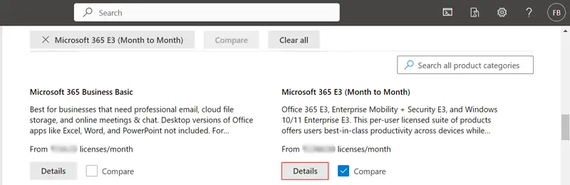 - Kies deMicrosoft 365 Enterpriseplannen en klik opDetails.