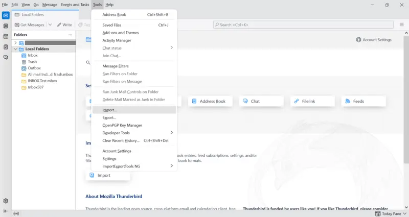 - Kies danHulpmiddelen>Importerenoptie van Thunderbird.