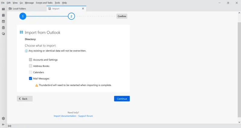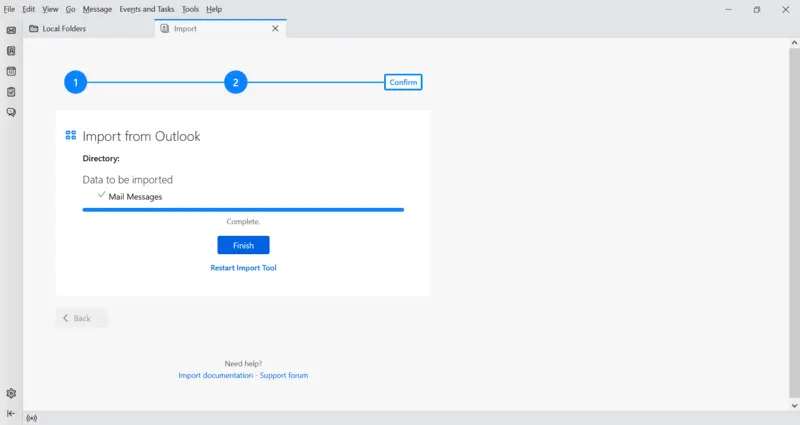 - Thunderbird importeert OSTproces succesvol afgerond.