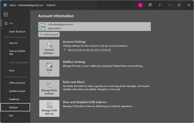 - Selecteer vervolgensOptiesom Outlook-opties te openen.