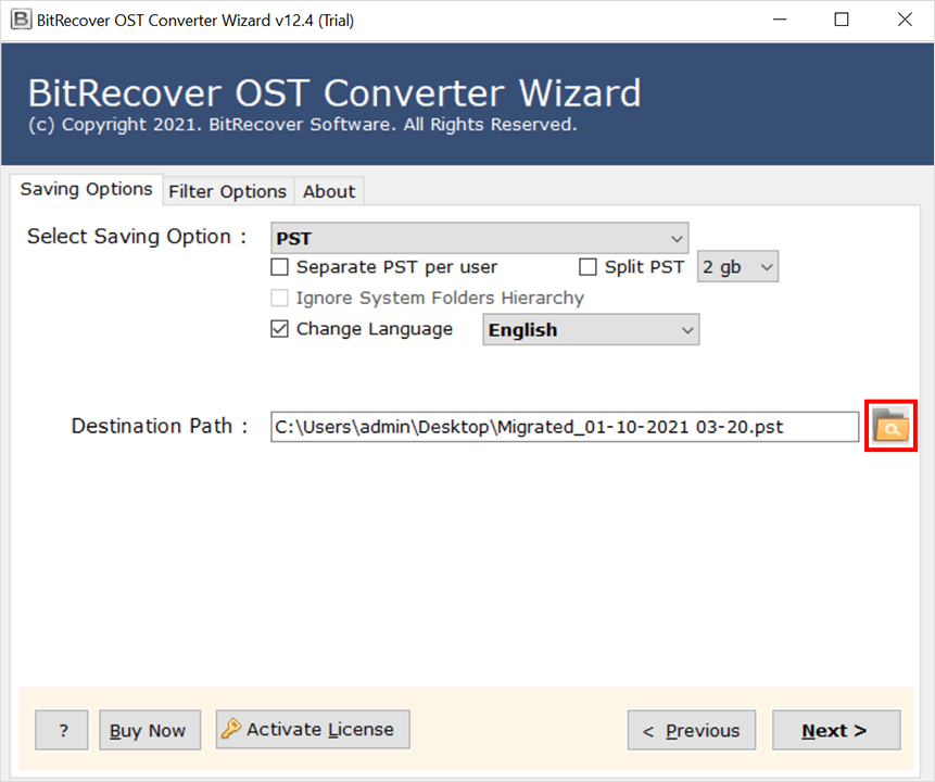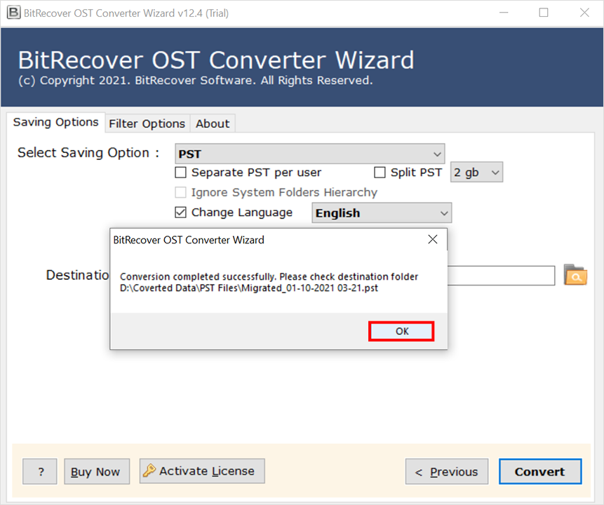 - Klik op deOverzettenknop en sla de resulterende e-mails op in PST-formaat.