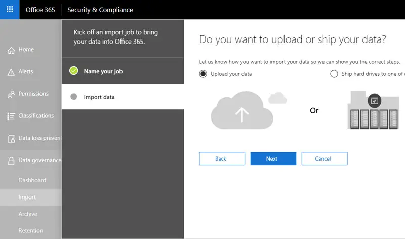 Een andere methode die u kunt gebruiken om de Office 365-mailbox vanaf een back-up te herstellen, is de Drive Shipping-methode, waarbij de Office 365 PST-gegevens naar een harde schijf worden gekopieerd en naar een van de fysieke locaties van Microsoft worden verzonden. En iets anders om op te merken over deze methode is dat alleen de beheerders en de bedrijven die de e-mailgegevens migreren deze mogen gebruiken.