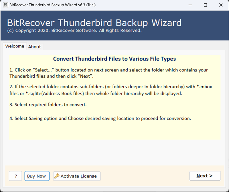 Hoewel er verschillende handmatige methoden zijn om alle e-mails uit Thunderbird te exporteren, hebben alle methoden grote nadelen die we hebben besproken. Om alle handmatige problemen aan te pakken, hebben onze software-ingenieurs een geautomatiseerde tool ontwikkeld die alle problemen van handmatige methoden overtreft. DeBitRecover Thunderbird Back-upwizardis ontworpen om alle e-mails van Thunderbird op te slaan in meer dan 30 opslagformaten, waaronder MBOX, EML, PST, MSG, PDF, DOC, CSV en nog veel meer.