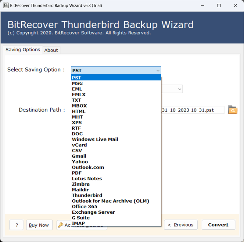 - De tool biedt meer dan 30 opslagopties waarmee de gebruiker Thunderbird naar PST, EML, MSG, PDF kan converteren of Thunderbird-bestanden kan overbrengen naar Office 365, Outlook, Yahoo, Zimbra en nog veel meer.