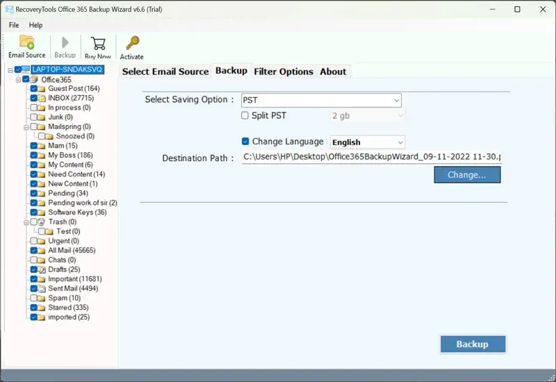 - Klik opBack-upom alle e-mails van Outlook 365 op de harde schijf op te slaan.