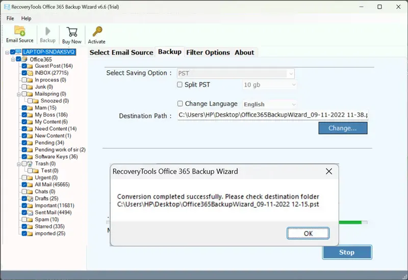 - Het downloaden van Office 365-e-mails is voltooidsuccesvol afgerond.