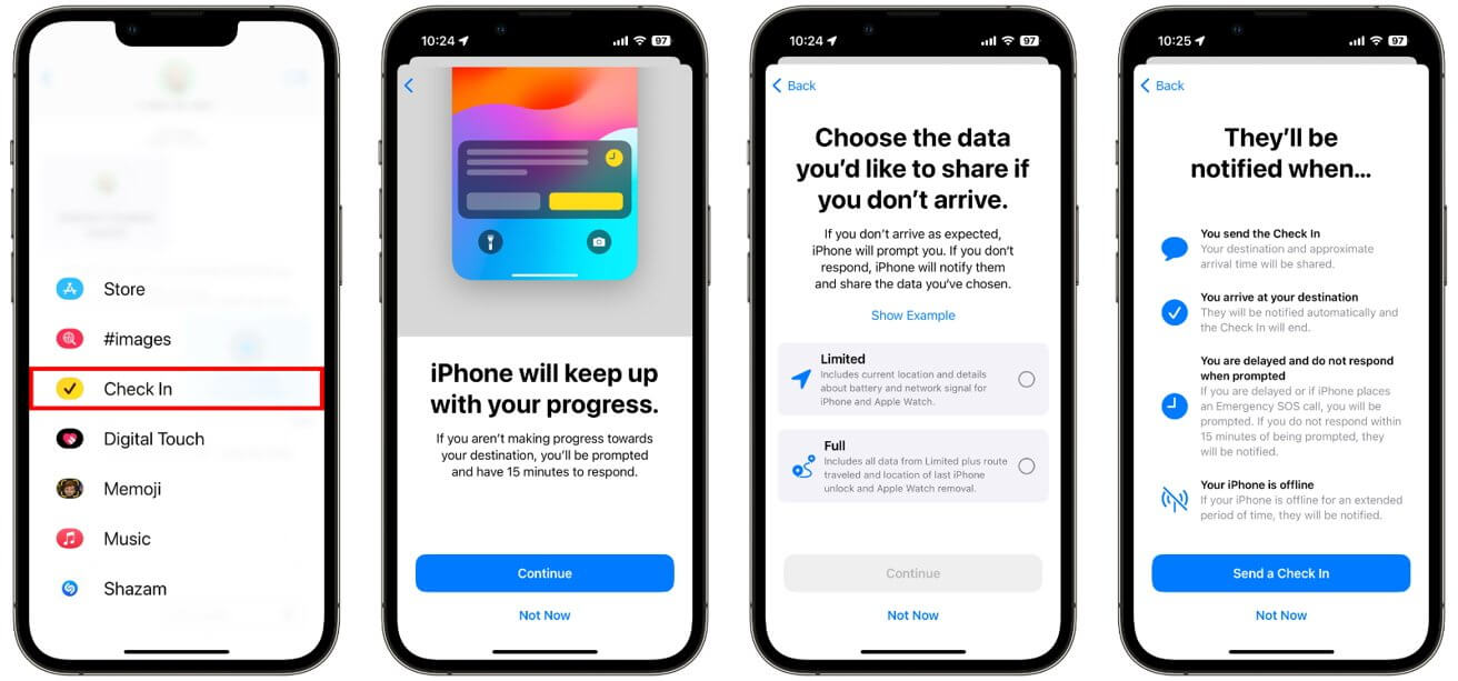 - 4Kies een van beide: "Als ik aankom": stel uw bestemming, reismodus en extra tijd in. Check In houdt uw reis in de gaten en geeft een melding als uw iPhone vertraging ondervindt.