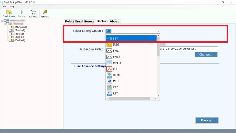 Stap 4:Kies het bestemmingspad dat u wilt bereikenPSTbestanden. Je kunt ook gebruikenGeavanceerde instellingsoptievoor specifieke e-mailback-ups. Druk op deBack-upknop.