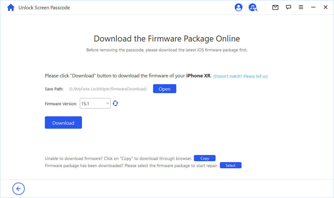 - 2Kies de meegeleverde firmwareversie op basis van uw apparaatmodel en klik op“Downloaden”. Wacht vervolgens een paar minuten totdat LockEraser het firmwarepakket heeft gedownload en geverifieerd.