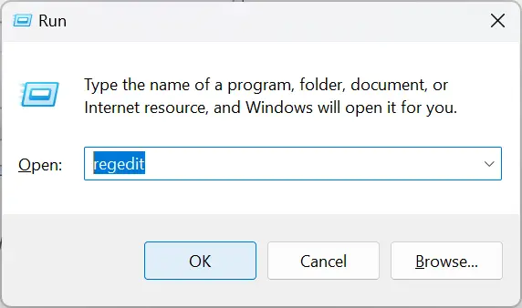 - Druk opWindows+RtypeRegediten klik op Enter.