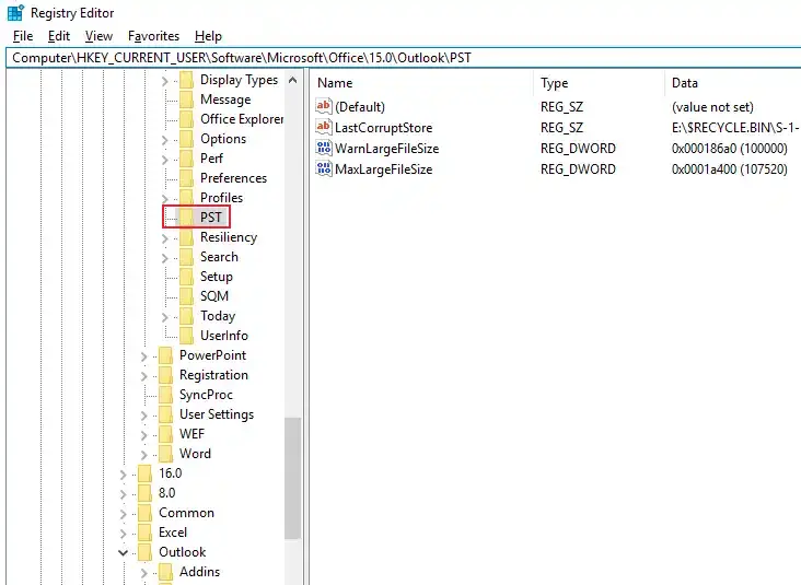 Open de Register-editor, ga naar HKEY_CURRENT_USER\Software\Microsoft\Office\15.0\Outlook\PST en maak de maximale bestandsgrootte en waarschuwingsbestandsgrootte aan. Stel MaxFileSize in op 107374182400 (VOOR 100 GB). Start Outlook opnieuw om de wijzigingen toe te passen.