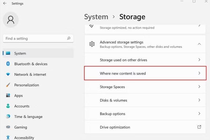 - Ga naarSysteemDanOpslagen klik opwaar nieuwe inhoud wordt opgeslagenoptie