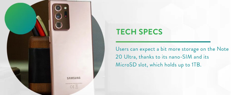 Gebruikers kunnen iets meer opslagruimte verwachten op de Note 20 Ultra, dankzij de nano-simkaart en het MicroSD-slot, dat maximaal 1 TB kan bevatten. Interne opslag omvat 512 GB of 128 GB, elk met 12 GB RAM. In plaats van een vlak scherm bevat de 20 Ultra een edge Infinity-O-scherm met HDR10+, dit keer met Dynamic AMOLED 2X, dat scherpe kleuren en een theaterachtige kijkervaring biedt.