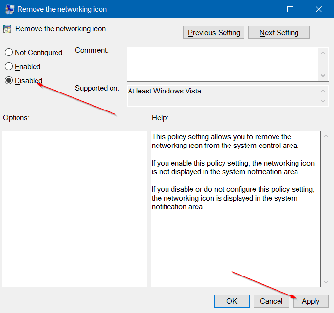 - Zoek Het netwerkpictogram verwijderen > dubbelklik > wijzig de instellingen van Ingeschakeld in Niet geconfigureerd of Uitgeschakeld.