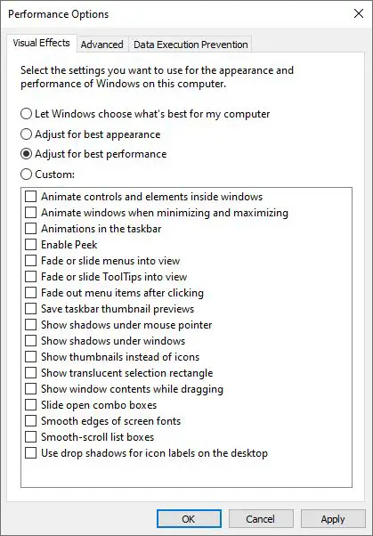 - Kies vervolgens Aanpassen voor de beste prestaties. Klik op Toepassen → OK.