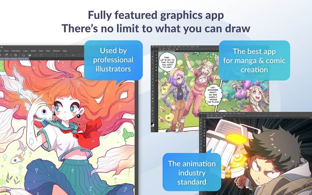 Pluspunten:Dankzij cloudbesparing kunt u vanaf meerdere apparaten tegelijk werken. Tal van gereedschappen, penselen en andere functies voor het tekenen van allerlei soorten kunstwerken. Vooral goed voor strip- en mangakunstenaars.