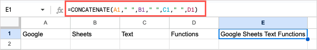 =CONCATENEREN(A1,” “,B1,” “,C1,” “,D1)