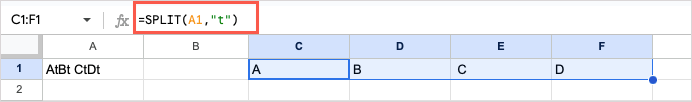 Voor een ander voorbeeld splitsen we de tekst in cel A1 met 't' als scheidingsteken. Hierdoor wordt de “t” verwijderd, net zoals het scheidingsteken voor de spatie erboven, en blijft de rest van de tekst behouden. Hier is de formule: