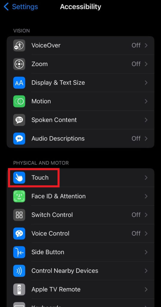AssistiveTouch, een ingebouwde toegankelijkheidsfunctie op de iPhone, kan ook worden gebruikt om een scrollende schermafbeelding te maken. Om lange schermafbeeldingen op de iPhone te maken via ondersteunende aanraking, moet je deze eerst activeren. Om het te activeren, opent uInstellingen> tik vervolgens opToegankelijkheid> tik vervolgens opAanraken> inschakelenAssisterende aanraking.